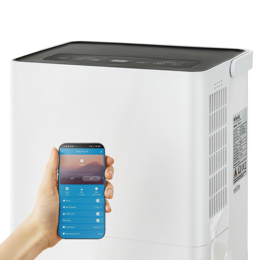 Możliwość sterowania urządzeniami przez Wi-Fi to standard obecnych czasów. Takiej opcji nie zabrakło w domowym osuszaczu powietrza Fersk Torr.