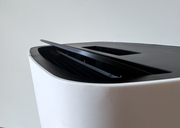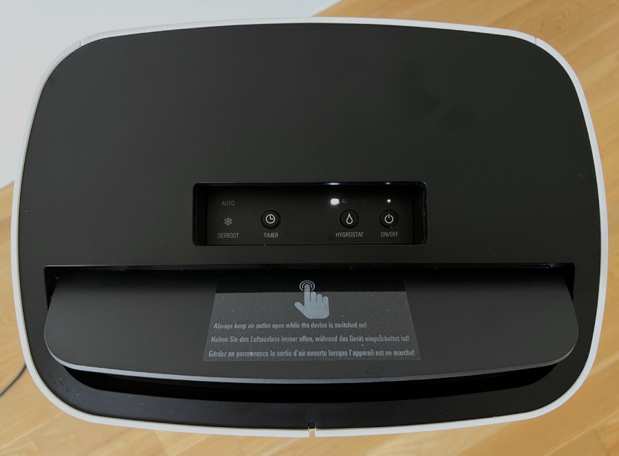 Pozytywnym dodatkiem jest żaluzja przy wylocie powietrza, dzięki której skumulowany strumień można skierować w pożądaną stronę np. na wilgotną ścianę lub suszarkę z mokrym praniem. Warto podkreślić, że jest ona regulowana ręcznie. Może się zdarzyć tak, że ktoś po włączeniu osuszacza zapomni unieść żaluzję… mało praktyczne rozwiązanie.