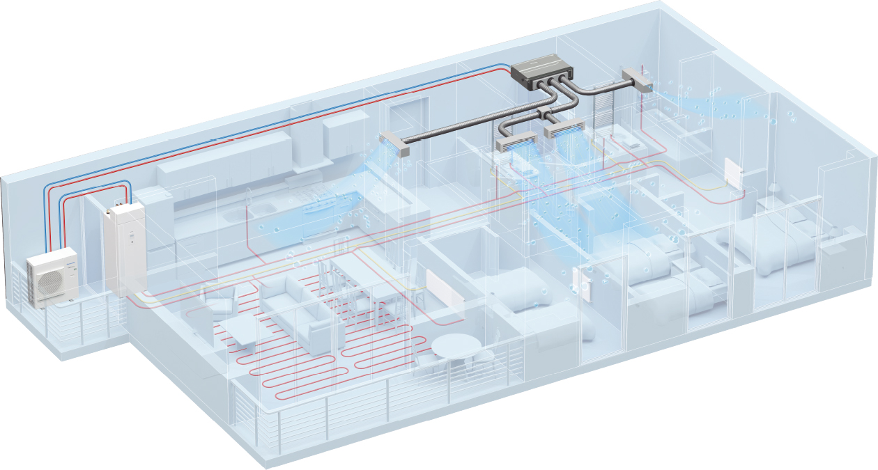 Aquarea EcoFleX – to przełomowa pompa ciepła przeznaczona dla nowo powstałych budynków, która synchronicznie obsługuje układ powietrze/powietrze i powietrze/woda. Łączy w sobie ogrzewanie i chłodzenie pomieszczeń, przez zastosowanie jednostki kanałowej z technologią nanoe™X zapewniającą oczyszczanie powietrza oraz odzysk ciepła na potrzeby przygotowania CWU. Dzięki wbudowanemu modułowi zapewnia łączność w czasie rzeczywistym za pomocą aplikacji „Aquarea Smart Cloud” lub „Panasonic Comfort Cloud”.