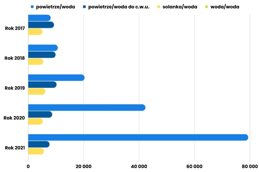 Jak widać po roku 2018 nastąpił gwałtowny wzrost liczby sprzedanych powietrznych pomp ciepła, które właściwie zdominowały rynek sprzedaży w Polsce. Dla porównania w roku 2017 sprzedano w sumie 17360 powietrznych pomp ciepła, natomiast w roku 2021 było to już 87000.