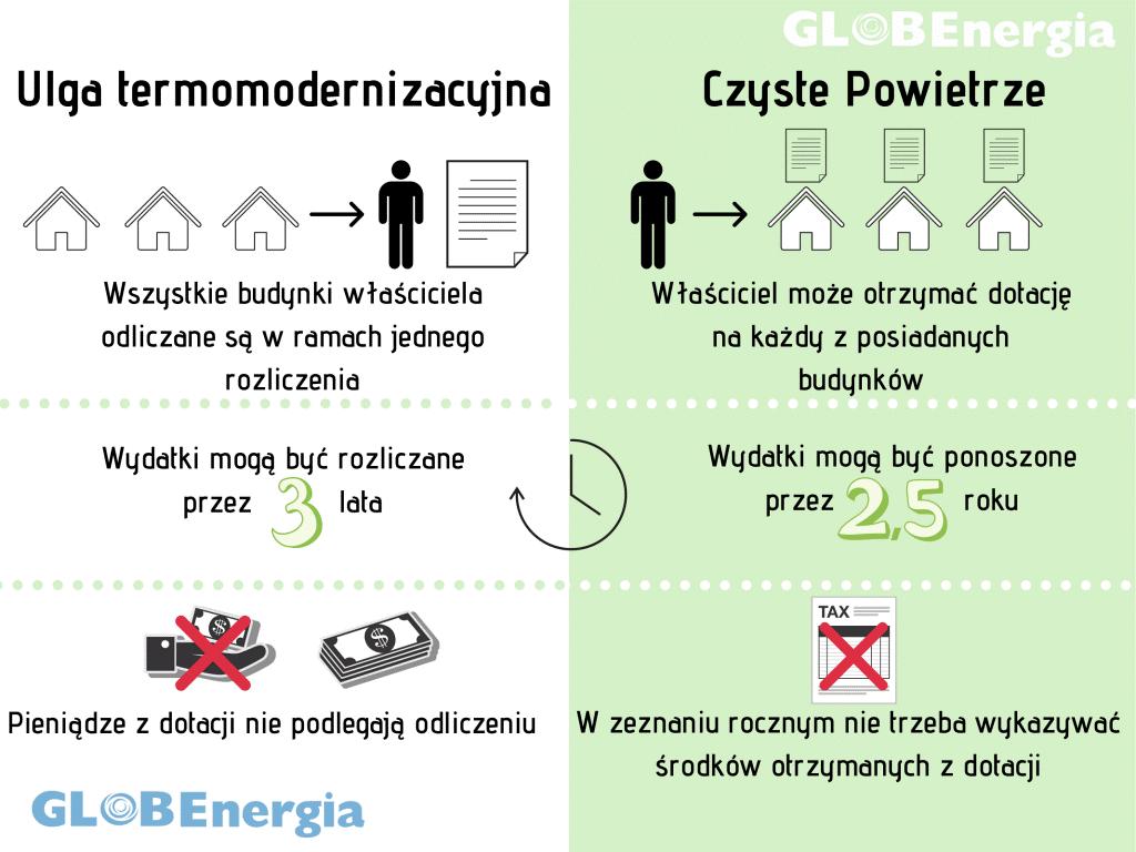 Dotacje uzyskiwane w ramach programu „Czyste Powietrze” można łączyć z podatkową ulgą termomodernizacyjną. Dotacja oraz ulga to instrumenty od siebie niezależne, które wspierają przedsięwzięcia termomodernizacyjne.