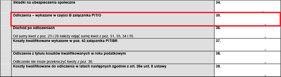 • PIT 36L (2 strona, w rubryce E. “Odliczenie dochodu zwolnionego, strat, składek na ubezpieczenia społeczne i kosztów kwalifikowanych oraz inne odliczenia”, poz. 35),