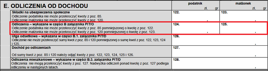 • PIT 37 (3 strona, w rubryce E. “Odliczenia od dochodu”, poz. 124 oraz 125 jeśli rozliczamy się wspólnie z małżonkiem),