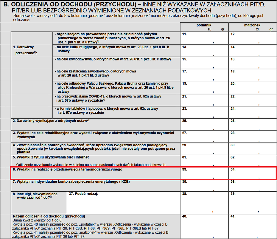 • PIT/O (1 strona, w rubryce B. “Odliczenia od dochodu (przychodu)”, poz. 33 lub 34 jeśli rozliczamy się wspólnie z małżonkiem).